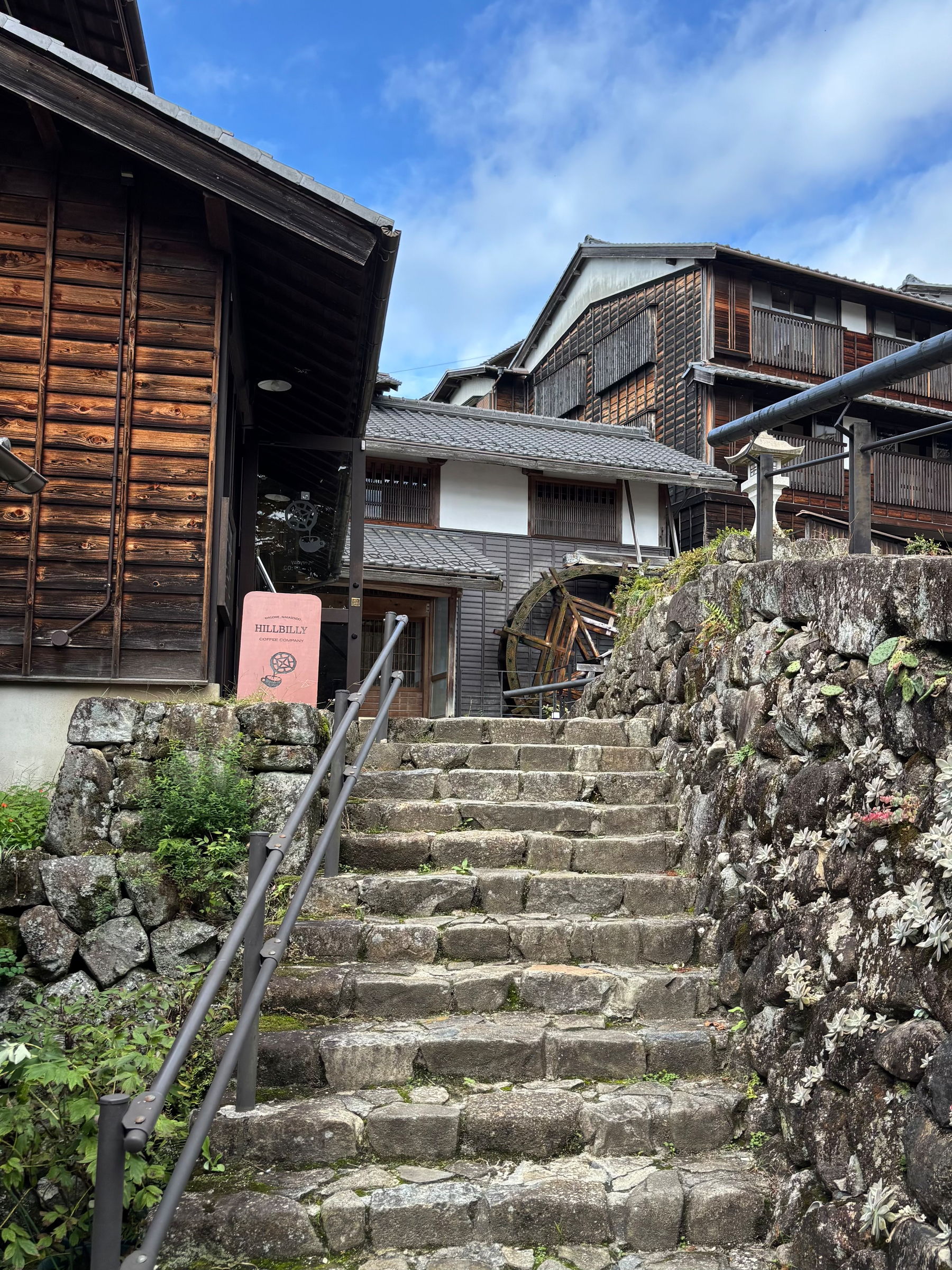 A cobblestone road in a Japanese forest with a dilapidated cabin in view.